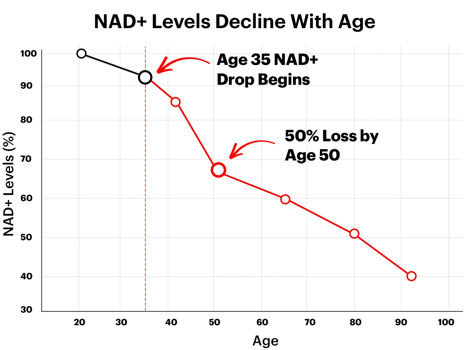 Boosting NAD levels as you age is essential for maintaining peak cellular function and energy. NAD drives critical processes like DNA repair, gene expression, and energy metabolism, but levels naturally plummet with age, leading to diminished vitality and accelerated aging. By increasing NAD, you can potentially reverse these declines, restoring cellular energy, enhancing DNA repair, and dramatically slowing the aging process. Higher NAD levels are also linked to superior mitochondrial function, key to unlocking sustained energy and youthful vitality.